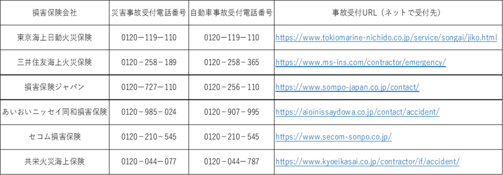 お客様におかれまして万一、被害が発生した場合は、弊社もしくは各保険会社までご連絡ください。